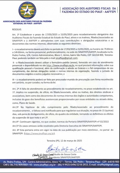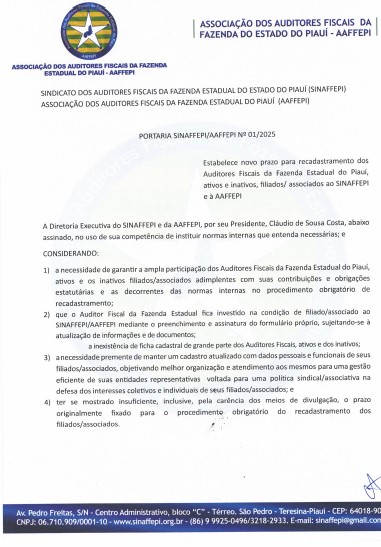 A Associação e o Sindicato dos Auditores Fiscais da Fazenda Estadual do Piauí convocam todos os seus associados e sindicalizados para a realização do recadastramento conforme portaria a seguir: